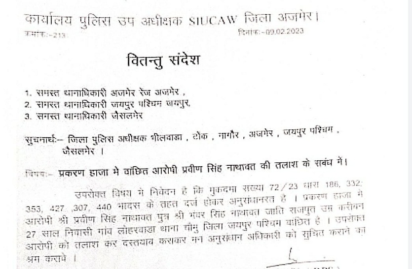 आरोपी प्रवीण सिंह की तलाश के लिए संदेश दो दिन पहले जारी किया गया है। इसमें लिखा है कि धारा 332, 353, 427, 307 व 440 आईपीसी के तहत दर्ज मामले में चौमूं के लोहरवाड़ा निवासी प्रवीण सिंह पुत्र भंवर सिंह नाथावत वांछित है। इसे पकड़कर सूचित करने के लिए कहा गया है। यह निर्देश जांच अधिकारी भंवर रणधीर सिंह की ओर से जारी किया गया है।