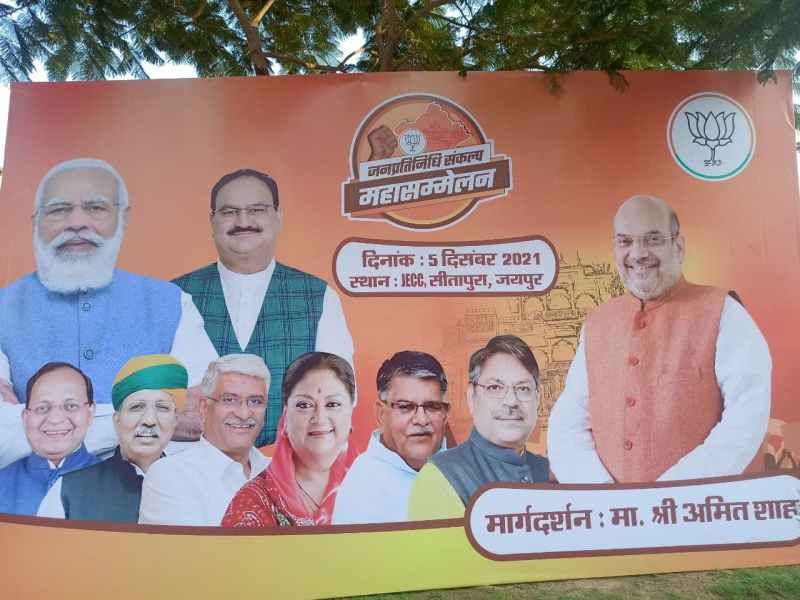 जेईसीसी के बाहर एक होर्डिंग भी चर्चा का विषय बना हुआ है। इस पोस्टर में कृषि राज्यमंत्री कैलाश चौधरी और उपनेता प्रतिपक्ष राजेंद्र राठौड़ का फोटो गायब है। जबकि पोस्टर में गजेंन्द्र सिंह शेखावत और अर्जुन मेघवाल को जगह मिली है। इसके अलावा प्रदेशाध्यक्ष सतीश पूनियां, पूर्व मुख्यमंत्री वसुंधरा राजे, गुलाबचंद कटारिया, अरुण सिंह के साथ राष्ट्रीय अध्यक्ष जेपी नड्डा, अमित शाह और प्रधानमंत्री के फोटो को शामिल किया गया है।