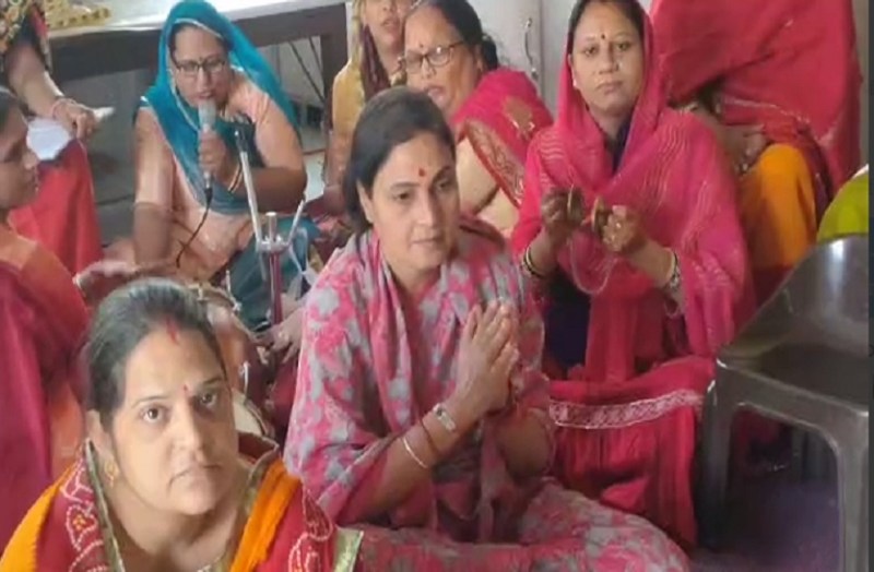 कांग्रेस प्रत्याशी अर्चना शर्मा ने मंदिर में कीर्तन करते हुए।