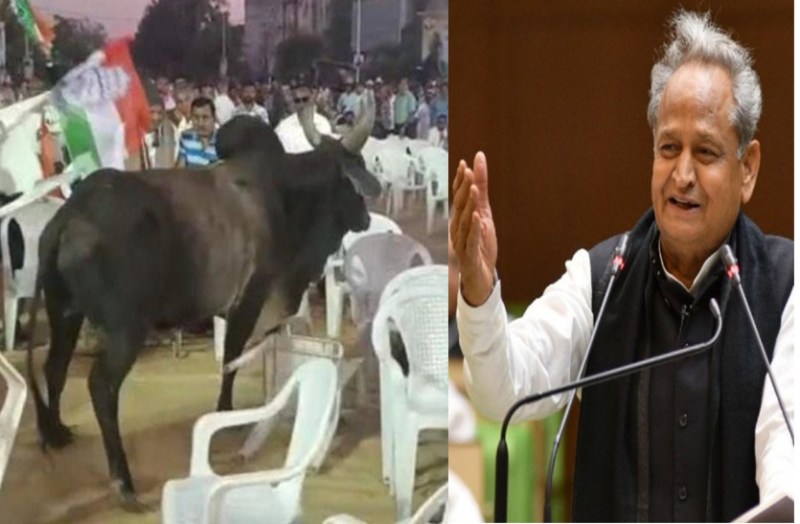 मेहसाणा शहर में सोमवार को राजस्थान के मुख्यमंत्री अशोक गहलोत व कांग्रेस के राष्ट्रीय अध्यक्ष मल्लिकार्जुन खरगे की सभा में एक सांड के आ जाने से भगदड़ मच गई। इस दौरान मुख्यमंत्री गहलोत का भाषण चल रहा था। गहलोत ने कहा कि वे बचपन से देख रहे हैं कि जब भी कांग्रेस की सभा होती है भाजपा वाले उसमें सांड छोड़ देते हैं। हुआ यूं कि मेहसाणा के हीरानगर चौक में कांग्रेस की चुनावी सभा थी।