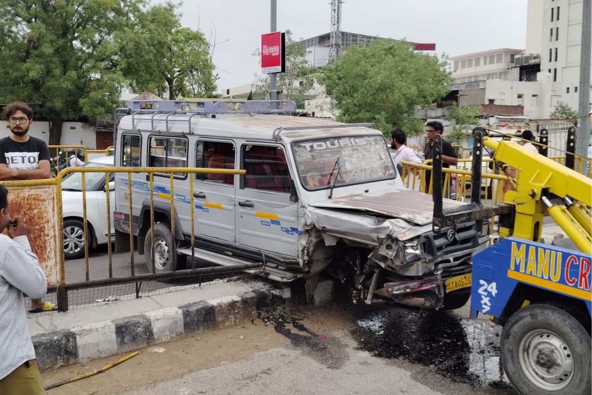 जयपुर। सीकर रोड पर आज सुबह एक टेंपो ट्रैक्स, कार व बाइक में भिड़ंत हो गई। हादसा इतना जबरदस्त था कि टेंपो ट्रैक्स रैलिंग तोड़ते हुए निकल गई। हादसे में बाइक सवार व टेंपो ट्रैक्स चालक घायल हुआ है। सूचना मिलने पर एक्सीडेंट थाना वेस्ट पुलिस मौके पर पहुंची। पुलिस ने घायलों को अस्पताल पहुंचाया, जहां उनका इलाज जारी है।