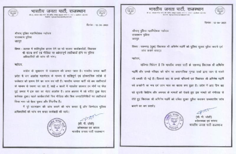 जोशी ने अपने दूसरे पत्र में अलवर में शांतिपूर्वक ज्ञापन देने जा रहे भाजपा कार्यकर्ताओं, विधायक संजय शर्मा पर बर्बरतापूर्ण लाठीचार्ज होने पर पुलिस अधिकारियों की जांच की मांग की है , जोशी ने कहा कि कांग्रेस के कुशासन से राजस्थान की जनता त्रस्त है , भारतीय जनता पार्टी प्रदेश में जन आक्रोश महाघेराव के माध्यम से शांतिपूर्ण और लोकतांत्रिक तरीके से कलेक्टर को ज्ञापन देने का काम कर रही है, लेकिन पुलिस जिस तरह से लाठियां बरसा रही है वो बेहद शर्मनाक है।