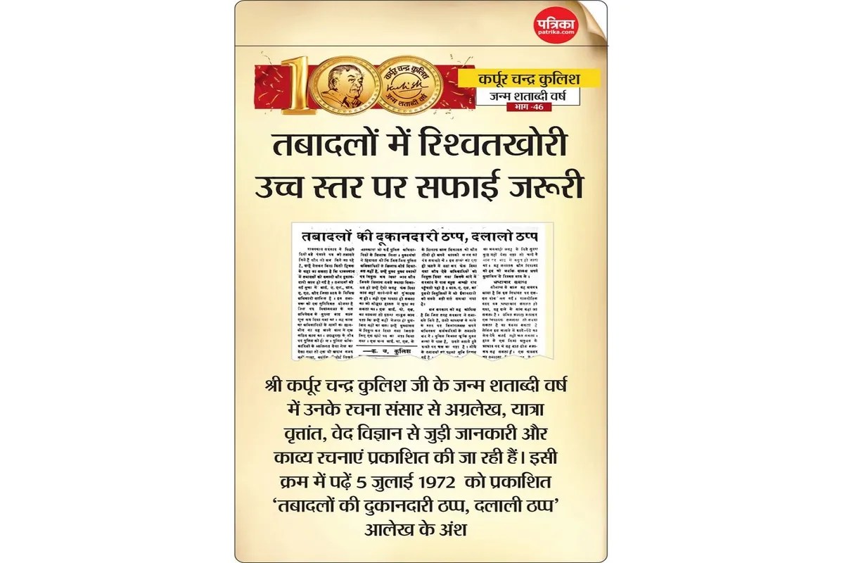 राजस्थान हाईकोर्ट ने जर्जर स्कूल भवनों की मरम्मत में देरी पर टिप्पणी की है कि 'राजनेता तबादलों में व्यस्त हैं और बच्चों पर ध्यान ही नहीं है। सरकारी स्तर पर तबादलों का दौर और इनमें राजनेताओं की रुचि नई बात नहीं। करीब पचपन साल पहले भी तबादलों को लेकर कुछ ऐसा ही माहौल था। राजस्थान में तत्कालीन सरकार ने तबादला प्रक्रिया में बदलाव किया तब भी श्रद्धेय कुलिश जी ने शासन को जो नसीहत दी वह आज भी प्रासंगिक है। आलेख के प्रमुख अंश: यों देखा जाए तो तबादले अपने आप में कोई चीज नहीं है। चूंकि अब यह एक बड़ी चीज बन गई है इसलिए यह सहज ही समझा जा सकता है कि सरकारी तंत्र कितनी गिरावट पर चला गया है। कुछ सालों से राजस्थान में यह माहौल बन गया था कि मंत्री और विधायकों का सबसे बड़ा काम तबादले करवाना ही रह गया था। तबादला अपने आप में इतना बड़ा कारोबार बन गया था कि विधायक व अन्य कार्यकर्ता इसमें बिचौलिए का काम संभाल बैठे थे। हालात ऐसे हो गए जिनसे लगता था कि राज्य की एक-एक कुर्सी बोली लगाकर ठेके पर उठा दी गई है। एक लाख नर-नारियों के प्रतिनिधि विधायक का सबसे बड़ा धंधा तबादले करवाना और ढाई करोड़ पर शासन करने वाले मंत्री का स्वार्थ और परमार्थ तबादले करना रह गया था। विभागों के अध्यक्ष अपनी कुर्सी पर बैठे-बैठे दस्तखत मारकर चौथ वसूली कर लेते थे। अगर किसी विभाग में किसी अफसर को मनचाही जगह के लिए तुरंत कुछ नहीं देना पड़ा तो चंदे के नाम पर बाद में वसूल हो जाता था। यह जलालत और गिरावट की हद थी जब शासक अपने मुलाजिम से रिश्वत मार ले। तबादलों में रिश्वतखोरी और चुनाव में चंदा वसूली के लिए जब अफसर लिप्त हो जाते हैं तो भ्रष्टाचार एक कानून या रिवाज का रूप धारण कर लेता है। तबादलों की रिश्वत और अफसरों की चंदाखोरी पर रोक लग जाए तो उसका असर नीचे तक पड़े बिना नहीं रहेगा। तबादलों के प्रसंग पर चर्चा करते समय एक और पहलू पर नजर डालना ठीक होगा। कुछ सरकारी विभाग ऐसे मिलेंगे जिनमें अगर किसी एलडीसी को यूडीसी बना दिया जाए तो शायद वह मंजूर नहीं करे। क्योंकि ऐसे एलडीसी के पास ऊपर की आमदनी के जो अवसर हैं वे यूडीसी के पास नहीं होते। जब तक उच्च स्तर पर सफाई नहीं होगी तब तक आम जनता को राहत नहीं मिलेगी। प्रशासन तंत्र से यह अपेक्षा की जाएगी कि काम करके दिखाएं। प्रशासन की जो साख जनता में समाप्त हो गई है उसे फिर जमाना है। रोजमर्रा के कामों में आम जनता को चुस्ती और फुर्ती नजर आनी चाहिए और सरकार की नीतियों पर अमल होना चाहिए।
