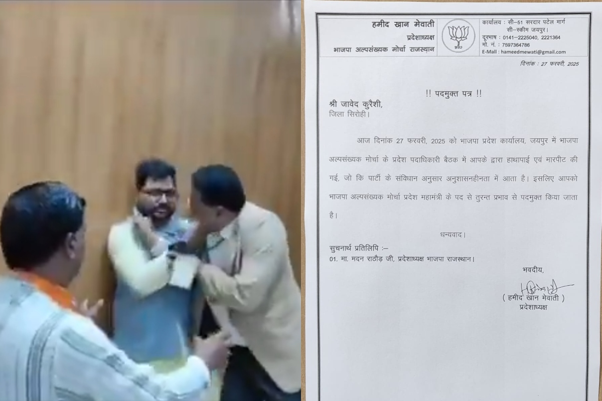 इधर, इस घटना के तुरंत बाद भाजपा अल्पसंख्यक मोर्चा के प्रदेशाध्यक्ष हमीद खान मेवाती ने कड़ा कदम उठाते हुए जावेद कुरैशी को उनके पद से हटा दिया। उन्होंने कहा कि प्रदेश कार्यालय में भाजपा अल्पसंख्यक मोर्चा के प्रदेश पदाधिकारी बैठक में आपके द्वारा हाथापाई एवं मारपीट की गई जो कि पार्टी के संविधान अनुसार अनुशासनहीनता में आता है। इसलिए आपको भाजपा अल्पसंख्यक मोर्चा प्रदेश महामंत्री के पद से तुरन्त प्रभाव से पदमुक्त किया जाता है।