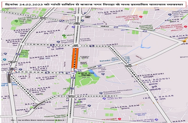 - गांधी सर्किल से बजाज नगर तिराहा, जे.एल.एन मार्ग के मध्य संचालित होने वाले सामान्य यातायात को डायवर्ट कर
