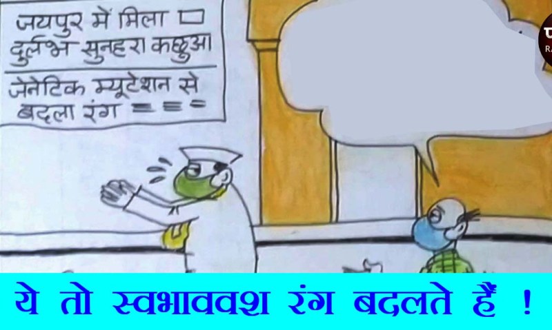 पूरी दुनिया में बेहद दुर्लभ माना जाने वाला गोल्डन कछुआ राजस्थान की राजधानी जयपुर में नजर आया है। इसे जयपुर चिडि़याघर के सुपुर्द कर दिया गया है। यह कछुआ चाकसू के काठावाला तालाब में मिला है. जानकारों ने बताया कि विश्व में छठीं बार ऐसा कछुआ नजर आया है . विशेषज्ञों के मुताबिक कछुए का यह दुर्लभ रंग होने की वजह जेनेटिक म्यूटेशन है। इसके कारण स्किन को रंग देने वाला पिगमेंट बदल गया । परिणामस्वरूप यह सुनहरा दिखाई दे रहा है। मगर हमारे देश के नेताओं के रंग बदलने की वजह दूसरी है. सत्ता में आने से पूर्व जनता से लुभावने वादे करना और फिर सत्ता हासिल हो जाने के बाद उन्हें भूल जाना, हमारे नेताओं की फितरत है. नेताओं को मौकापरस्ती के लिए ही जाना जाता है. वर्तमान समय में राजनीति में वही व्यक्ति टिक पाता है जो हालात के अनुसार अपने आप को बदल ले. सिद्धांतों और नैतिकता को ताक पर रखने वाले नेता ही इस दौर में तरक्की के पायदान पर चढ़ते हैं. नेताओं के इस तरह रंग बदलने की तुलना गिरगिट से भी की जाती है.देखिये इस मुद्दे पर कार्टूनिस्ट सुधाकर का नजरिया.