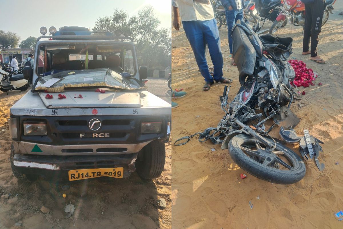 चौमूं में जयपुर रोड पर दुर्घटनाग्रस्त सवारी गाड़ी व बाइक।