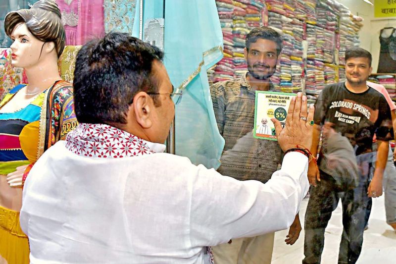 जीएसटी के नए स्लैब को लेकर राज्यसभा सांसद घनश्याम तिवाड़ी, विधायक कैलाश वर्मा व ग्रेटर निगम महापौर सौम्या गुर्जर के नेतृत्व में व्यापारियों ने सांगानेर के बाजारों में पैदल घूमकर लोगों को जागरूक किया। जीएसटी कम होने के फायदे बताएं।