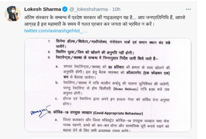 पाली के जैतारण से बीजेपी विधायक अविनाश गहलोत के ट्वीट पर शनिवार को बवाल मच गया। विधायक ने कोरोना गाइडलाइन्स की फेक और एडिटेड कॉपी ट्वीटर पर पोस्ट करते हुए तंज कसते हुए लिखा कि राजस्थान की सत्ता में बैठे ज्योतिषियों की भारी मांग। अविनाश गहलोत ने लिखा कि राजस्थान सरकार का नोटिस पढ़िए। अंतिम संस्कार में 20 लोग शामिल हो सकते हैं और इसकी सूचना 4 दिन पहले एसडीएम को देनी होगी। इस पर मुख्यमंत्री के ओएसडी लोकेश शर्मा ने लिया संज्ञान लेते हुए राज्य सरकार की ओर से जारी की गई सही वाली गाइडलाइन ट्वीट करके विधायक अविनाश गहलोत को नसीहत दी। ओएसडी लोकेश शर्मा ने लिखा कि आप जनप्रतिनिधि हैं, आपसे आग्रह हैं। इस महामारी के समय में गलत प्रचार कर जनता को भ्रमित न करें। दरअसल, राज्य सरकार की ओर से जारी गाइडलाइन में यह निर्देश दिए गए हैं कि अनिवार्य रूप से फेस मास्क पहन,सामाजिक दूरी एवं थर्मल स्कैनिंग, हैंड वॉश और सैनिटाइजर के प्रावधानों के साथ अधिकतम 20 व्यक्तियों के साथ अंतिम संस्कार किया जा सकता है।