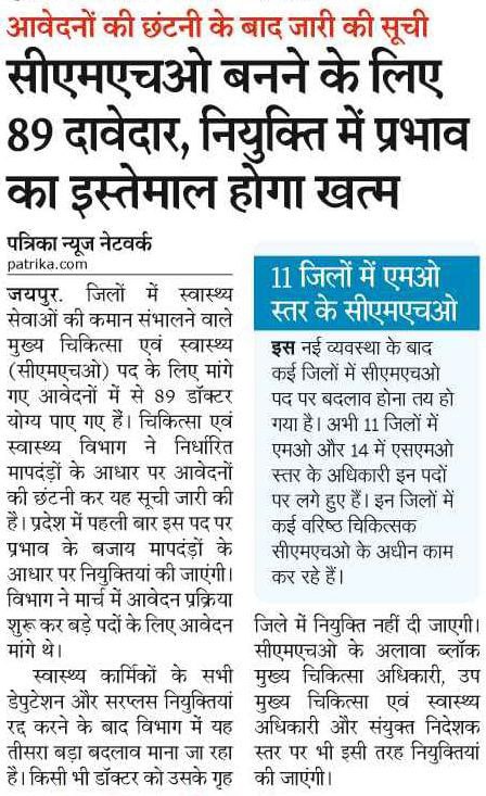 जयपुर. जिलों में स्वास्थ्य सेवाओं की कमान संभालने वाले मुख्य चिकित्सा एवं स्वास्थ्य (सीएमएचओ) पद के लिए मांगे गए आवेदनों में से ८९ डॉक्टर योग्य पाए गए हैं। चिकित्सा एवं स्वास्थ्य विभाग ने निर्धारित मापदंड़ों के आधार पर आवेदनों की छंटनी कर यह सूची जारी की है। प्रदेश में पहली बार इस पद पर प्रभाव के बजाय मापदंड़ों के आधार पर नियुक्तियां की जाएंगी। विभाग ने मार्च में आवेदन प्रक्रिया शुरू कर बड़े पदों के लिए आवेदन मांगे थे।