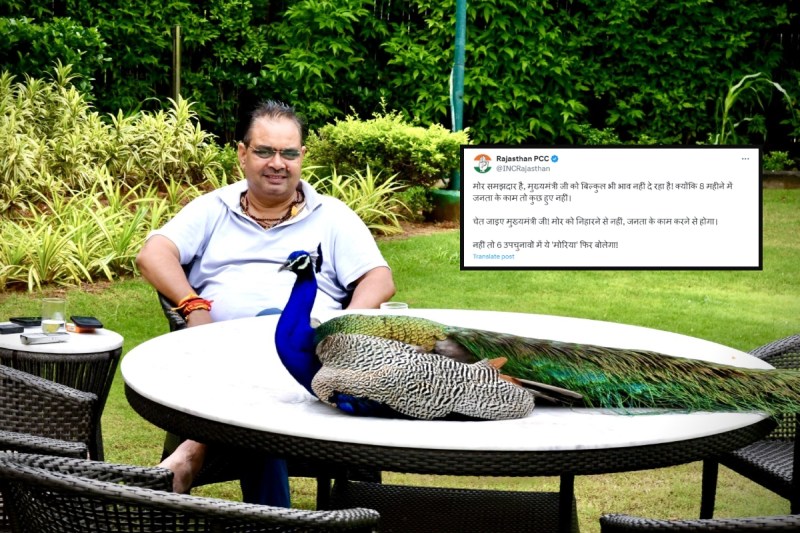 राजस्थान के मुख्यमंत्री भजनलाल शर्मा ने शनिवार को सोशल मीडिया पर मोर के साथ तस्वीरें शेयर की। जिस पर प्रदेश कांग्रेस ने निशाना साधा है। कांग्रेस ने सीएम शर्मा के पोस्ट को रिपोस्ट करते हुए लिखा कि 'चेत जाइए मुख्यमंत्री जी! मोर को निहारने से नहीं, जनता के काम करने से होगा।'