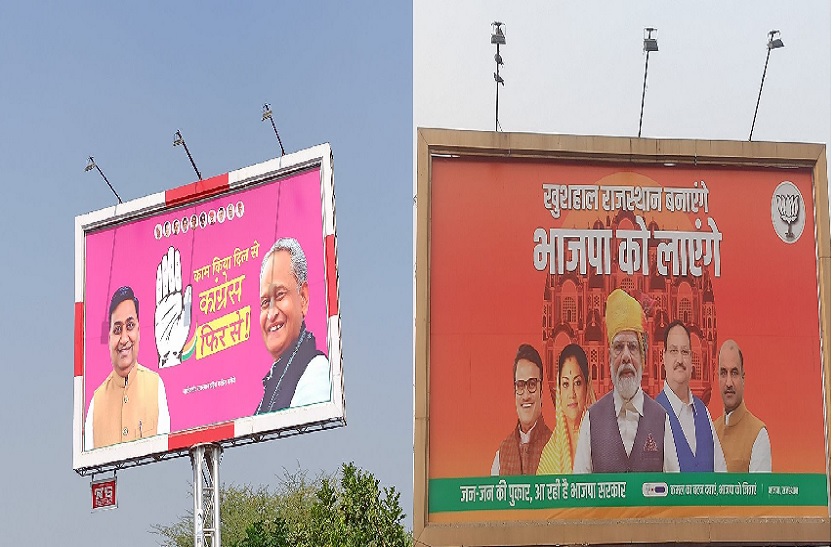 Rajasthan Election: विधानसभा चुनाव की बिसात बिछ चुकी है। कांग्रेस और भाजपा दोनों ही पार्टियों के क्षत्रपों ने रण भी संभाल लिया है। आरोप-प्रत्यारोप के जरिए दोनों पार्टियां एक-दूसरे को घेर रही है। इसी बीच दोनों पार्टियों के पोस्टर और होर्डिंग जनता के बीच चर्चा का विषय बने हुए हैं।