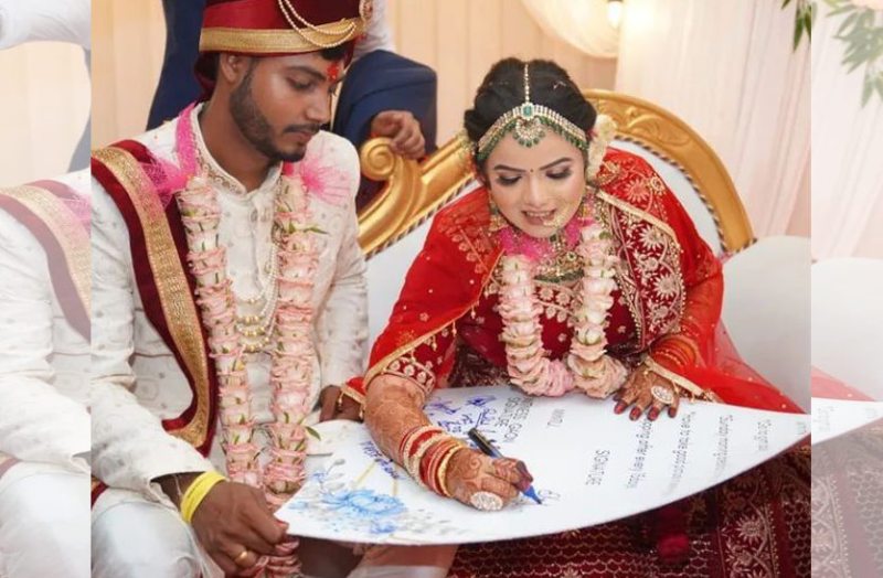 शादी के दौरान स्टेज पर बैठे हुए असम की शांति और मिंटू ने भविष्य में क्या करें और क्या न करें, की सूची के साथ एक अनुबंध पर हस्ताक्षर किए। इसमें कागज के बड़े कार्डबॉर्ड पर छपे अनुबंध पर हस्ताक्षर करते हुए वे बहुत खुश नजर आ रहे हैं।