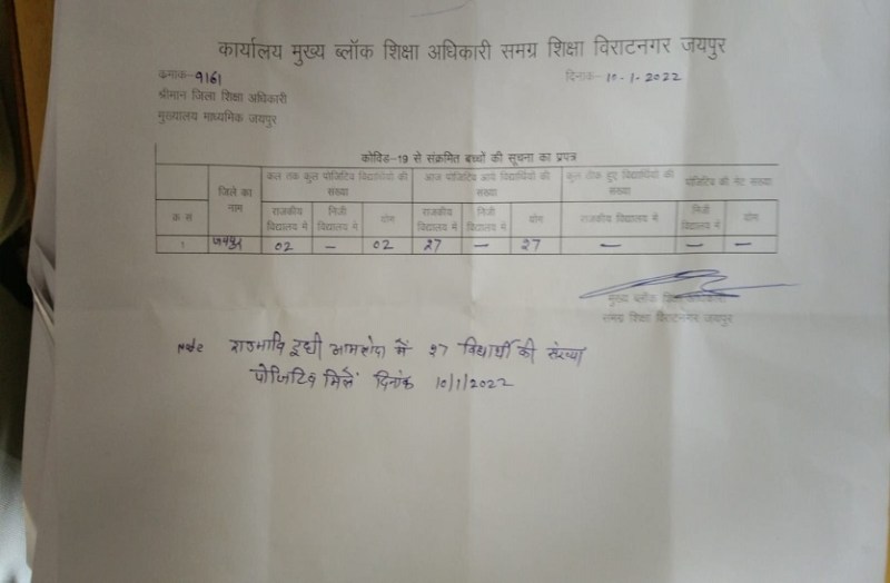 राज्य सरकार ने कोविड के बढ़ते संक्रमण के बाद शहरी क्षेत्र के स्कूलों को 12वीं तक बंद कर इतिश्री कर ली और ग्रामीण क्षेत्रों के स्कूल खुले रखने का निर्णय लिया। नतीजा सोमवार को ग्रामीण क्षेत्रों के स्कूलों में भी कोविड ने आखिर अपनी दस्तक दे ही दी। राजधानी जयपुर के विराटनगर क्षेत्र के राजकीय उच्च माध्यमिक विद्यालय दूधी आमलोदा के दो विद्यार्थी कोविड पॉजिटिव पाए गए। जिसके बाद पूरे स्कूल को सेनेटाइज किया गया। साथ ही स्कूल के सभी स्टाफ और बच्चों को अपना कोविड टेस्ट करवाने के लिए कहा गया। जानकारी के मुताबिक इस स्कूल के अब तक 27 विद्यार्थी कोविड पॉजिटिव आ चुके हैं।