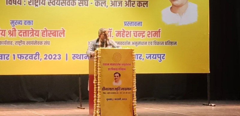 जयपुर। बिड़ला ऑडिटोरियम में बुधवार को दीनदयाल स्मृति व्याख्यान का आयोजन किया गया। आरएसएस कल, आज और कल विषय पर व्याख्यान पर आरएसएस के सरकार्यवाह दत्तात्रेय होस्बाले ने कहा कि संघ को समझने के लिए दिमाग नहीं दिल चाहिए।केवल दिमाग से काम नहीं चलेगा, क्योंकि दिल और दिमाग बनाना ही संघ का काम है। यही वजह है कि आज संघ का प्रभाव भारत के राष्ट्रीय जीवन में है।