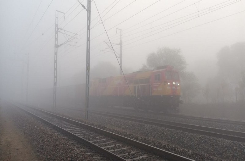श्रीमाधोपुर में कोहरे के बीच दिन में लाइट जलाकर गुजरती ट्रेन।