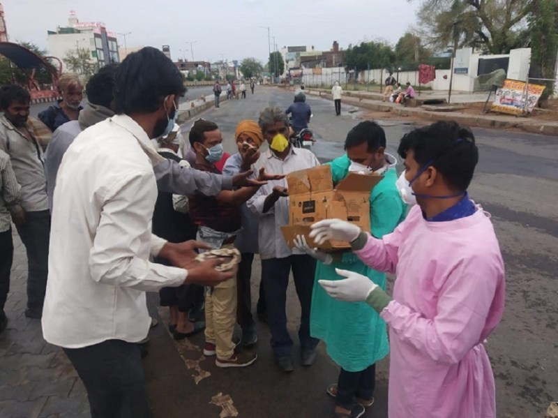 सीतापुरा में श्रमिकों को भोजन वितरित करते सामाजसेवी संगठन के कार्यकर्ता