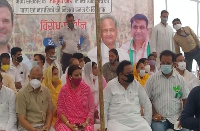 डोटासरा के नेतृत्व में धरना— प्रदेश कांग्रेस के अध्यक्ष गोविंद सिंह डोटासरा के नेतृत्व में दिए गए इस धरने में मंत्री प्रताप सिंह खाचरियावास, बीडी कल्ला, महेश जोशी, रघु शर्मा, संयम लोढ़ा, महादेव खण्डेला, खिलाडीलाल बैरवा, गोपाल मीणा, प्रदेश सचिव पुष्पेन्द्र भारदाज, मुमताज मसीह,जसवंत गुर्जर, ललित तूनवाल, सुरेश चौधरी, आर आर तिवाडी, मनोज दुग्गल,आयुष भारदाज सहित जयपुर के विधायक, पार्टी पदाधिकारी सहित अन्य नेता मौजूद थे। सभी नेताओं ने केन्द्र सरकार को कोसते हुए कहा कि भाजपा के राज में सब बेहाल है। इस मौके पर पीसीसी अध्यक्ष डोटासरा ने कहा कि अब तो ये साबित हो गया है कि प्रधानमंत्री मोदी और गृहमंत्री अमित शाह ने मंत्रिमंडल से हटाए गए अपने ही मंत्रियों की भी जासूसी कराई थी, क्यों कि कई मंत्री सरकार की कार्य प्रणाली से खुश नहीं थे। उन्होंने कहा कि सच्चाई सामने आनी चाहिए कि आखिर मंत्रियों को हटाने का आधार क्या था। डोटासरा ने ये चुनोती भी दी कि उनके खिलाफ किसी भी मामले की जाँच करा लें, लेकिन निम्बाराम को तो सामने लाएं।