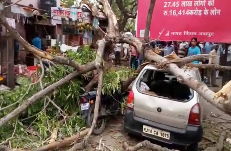 राजधानी जयपुर में सुबह आसमान साफ होने पर लोगों ने राहत की सांस ली, लेकिन 8 बजते-बजते धूल का गुबार उठा और 50 किलोमीटर प्रतिघंटा की रफ्तार से हवा चलने से जिला प्रशासन में खलबली मच गई। जयपुर कलक्टर सिद्धार्थ महाजन ने स्कूलों की छुट्टी 10 बजे करवा दी। प्रशासन ने अलर्ट जारी कर शाम 6 बजे तक घरों में ही रहने को कहा है। जयपुर में आंधी से एसएमएस अस्पताल के बाहर एक विशाल पेड़ गिर गया। सडक़ पर खड़े वाहन क्षतिग्रस्त हो गए। एक महिला को हल्की चोट आई। अस्पताल के बाहर स्थित एक स्टाल पर पेड़ गिरने से वहां अफरा तफरी मच गई।