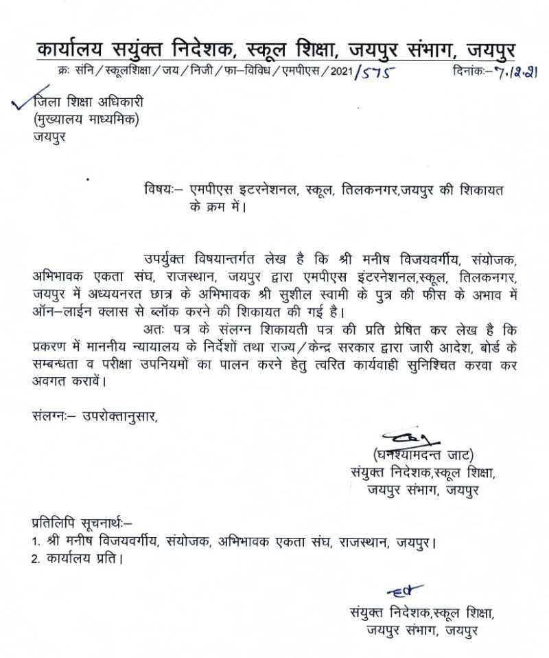 प्रदेश के विद्यार्थियों और अभिभावकों की समस्याओं के समाधान, कोविड में प्रभावित और पीडि़तों को राहत की मांगों को लेकर संघर्षरत अभिभावक एकता आंदोलन राजस्थान की शहर के चार बड़े निजी स्कूलों के खिलाफ की गई शिकायत के बाद संज्ञान लेते हुए मंगलवार को संयुक्त शिक्षा निदेशक ने डीईओ को पूरे प्रकरणों की जांच कर त्वरित कार्यवाही करने के निर्देश दिए हैं। संयुक्त निदेशक स्कूल शिक्षा घनश्याम दत्त जाट ने राजधानी के तीन बड़े नामचीन विद्यालयों सीडलिंग, रुक्मणी बिड़ला, सेंट एंसलम और माहेश्वरी स्कूलों में डीईओ माध्यमिक रवींद्र कुमार को निर्देश दिए हैं कि वह स्कूलों में सर्वोच्च न्यायालय के निर्देशों ,केंद्र और राज्य सरकार की ओर से जारी आदेशों, बोर्ड की संबद्धता और परीक्षा उप नियमों का पालन करवाए।