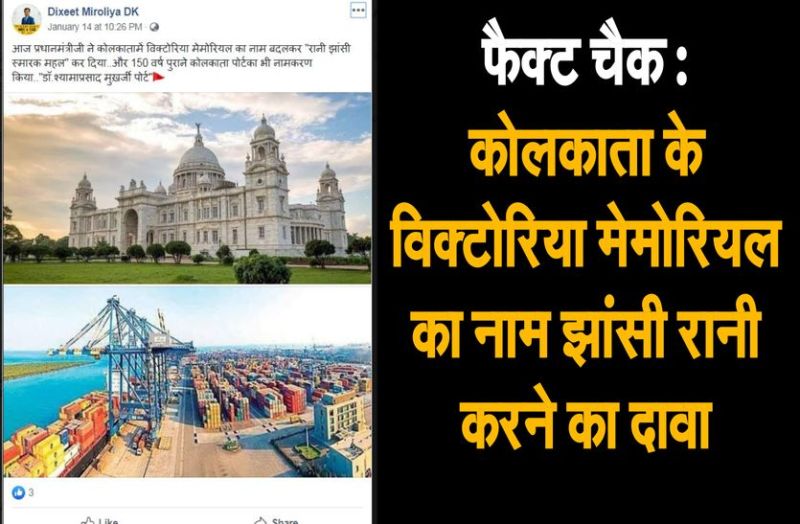 फेसबुक यूजर संजय एस धमेलिया ने दो फोटो को शेयर करते हुए लिखा, "आज प्रधानमंत्रीजी ने कोलकाता में विक्टोरिया मेमोरियल का नाम बदलकर "रानी झांसी स्मारक महल" कर दिया.. और 150 वर्ष पुराने कोलकाता पोर्ट का भी नामकरण किया.. "डॉ. श्यामाप्रसाद मुखर्जी पोर्ट"