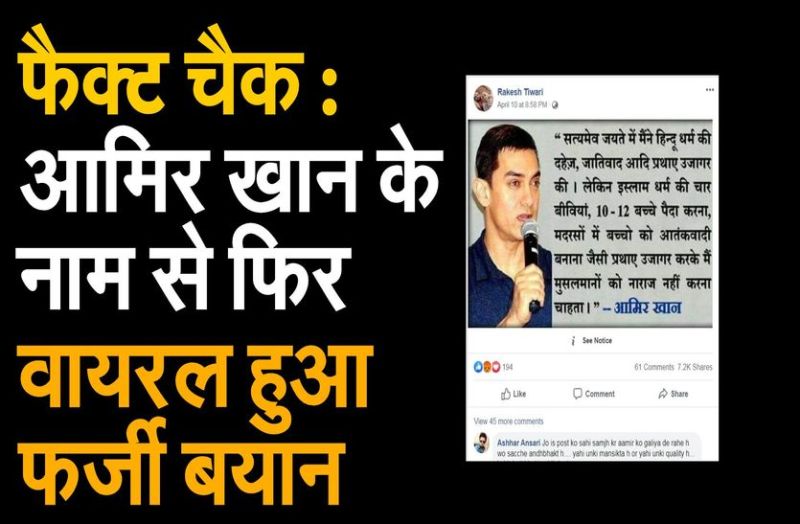 सोशल मीडिया पर फिर एक बार बॉलीवुड एक्टर आमिर खान के नाम से एक फर्जी बयान वायरल हो रहा है। वायरल पोस्ट में आमिर खान की एक तस्वीर के साथ ये बयान शेयर किया गया है। इसमें लिखा है कि 'सत्यमेव जयते में मैंने हिन्दू धर्म की दहेज, जातिवादी आदि प्रथाएं उजागर की, लेकिन इस्लाम धर्म की चार बीवियां, 10-12 बच्चे पैदा करना, मदरसे में बच्चों को आतंकवादी बनाना जैसी प्रथाएं उजागर करके मैं मुसलमानों को नाराज करना नहीं चाहता।Ó उल्लेखनीय है कि सत्यमेव जयते आमिर खान और किरण राव की ओर से निर्मित एक टीवी टॉक शो है, जिसके जरिये वर्ष 2012 में खान ने पहली बार टेलीविजन जगत में कदम रखा था।