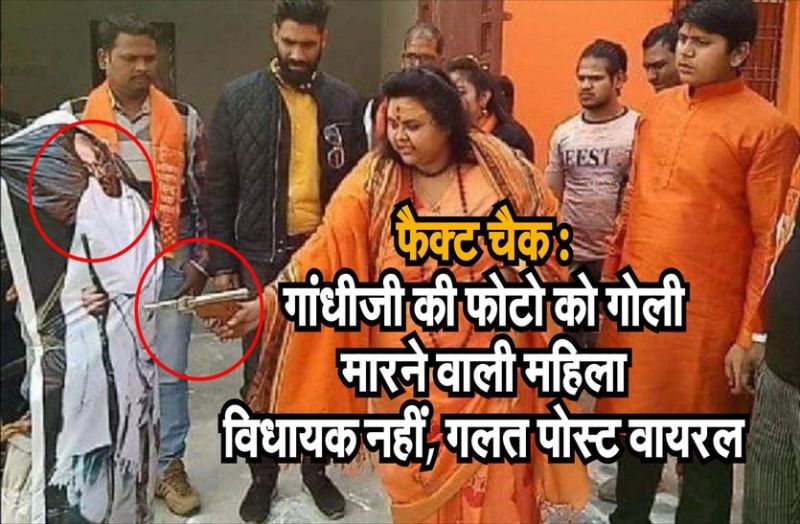 सोशल मीडिया पर वायरल हो रहे एक वीडियो में भगवा साड़ी पहने हुई एक महिला महात्मा गांधी की प्रतिमा को गोली मारती हुई नजर आ रही हैं। दावा किया जा रहा है कि यह काम भारतीय जनता पार्टी विधायक अनिल उपाध्याय का है। राजस्थान पत्रिका की फैक्ट चैक टीम ने इस वायरल मैसेज के पीछे का सच जाना तो यह दावा गलत निकला। जिस वीडियो को बीजेपी के कथित विधायक अनिल उपाध्याय के नाम से वायरल किया जा रहा है, वह वास्तव में हिंदू महासभा की राष्ट्रीय सचिव पूजा शकुन पांडेय हैं, जिनके खिलाफ इस मामले में आईपीसी की कई धाराओं के खिलाफ मुकदमा दर्ज हो चुका है।
