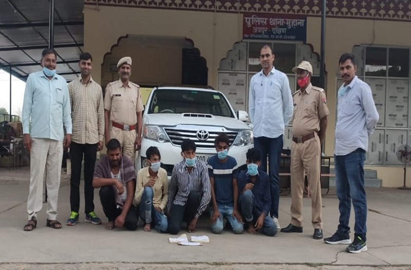 मुहाना थाना पुलिस ने सोने जैसी थातु की नकली ईट को सोने की ईट बताकर लोगों के साथ ठगी करने वाली मेव गैंग का खुलासा किया हैं। पुलिस ने इस मामले में पांच शातिर ठगों को पकड़ा हैं। पुलिस ने उनके कब्जे से ठगी गई राशि 54 हजार 680 रुपए और एक कार जब्त की हैं। गैंग के सरगना मोहम्मद राईल और सोहिल पूर्व में भी अवैध हथियार रखने तथा लूट की वारदात में गिरफ्तार हो चुके हैं।