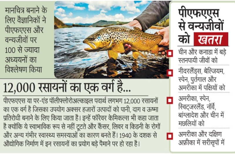 वॉशिंगटन. 'फॉरेवर केमिकल्स' के रूप में जाना जाने वाला पीएफएएस रसायन लंबे समय से पर्यावरण के लिए गंभीर खतरा बना हुआ है। अमरीका के इन्वायरनमेंटल वर्किंग ग्रुप (ईडब्ल्यूजी) ने अपने नवीनतम शोध में पाया है कि अंटार्कटिका को छोड़ दुनियाभर में पीएफएएस का व्यापक प्रदूषण 330 से अधिक जानवरों की प्रजातियों को नुकसान पहुंचा रहा है। पीएफएएस रसायन को ट्रैक करने वाले इस संगठन ने अपनी तरह का पहला मानचित्र तैयार कर बताया कि इस प्रदूषक से दुनियाभर में वन्यजीवों को कहां-कहां खतरा है। मानचित्र बनाने के लिए वैज्ञानिकों ने पीएफएएस और वन्यजीवों पर 100 से ज्यादा अध्ययनों का विश्लेषण किया।