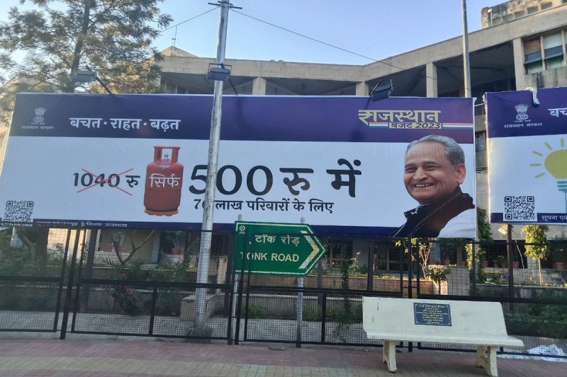 दरअसल गहलोत सरकार की ओर से प्रमुख घोषणाओं के होर्डिंग्स-बैनर राजधानी जयपुर और प्रदेश के कई अलग-अलग जिलों में प्रमुख चुनाव पर लगाए गए हैं। इनमें चिरंजीवी योजना का बीमा 25 लाख रुपए करने, रसोई गैस सिलेंडर 500 में देने और 100 यूनिट बिजली फ्री देने वाली बजट घोषणाओं के होर्डिंग्स लगाए गए हैं।
