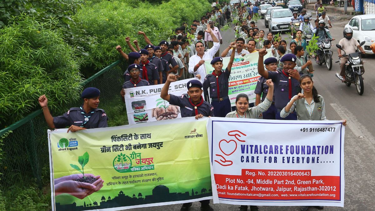 जयपुर। 'पेड़ लगाओ, जीवन बचाओ', 'ग्रीन जयपुर, क्लीन जयपुर' और 'सांसें हो रहीं हैं कम, आओ पेड़ लगाएं हम'… जैसे नारों से गुरुवार को मुरलीपुरा के मार्ग गूंज उठे। हाथों में पौधे थामे, अनुशासन से कदमताल करते छात्र-छात्राएं हरियाली क्रांति के दूत बनकर सड़कों पर निकले। मौका था पत्रिका के ग्रीन जयपुर अभियान के तहत (हरियाळो राजस्थान) वाइटल केयर फाउंडेशन के तत्वावधान में निकाली गई रैली का। जिसके माध्यम से एन.के. पब्लिक स्कूल के सैकड़ों विद्यार्थियों ने आमजन को पर्यावरण संरक्षण और पौधरोपण का संदेश दिया।