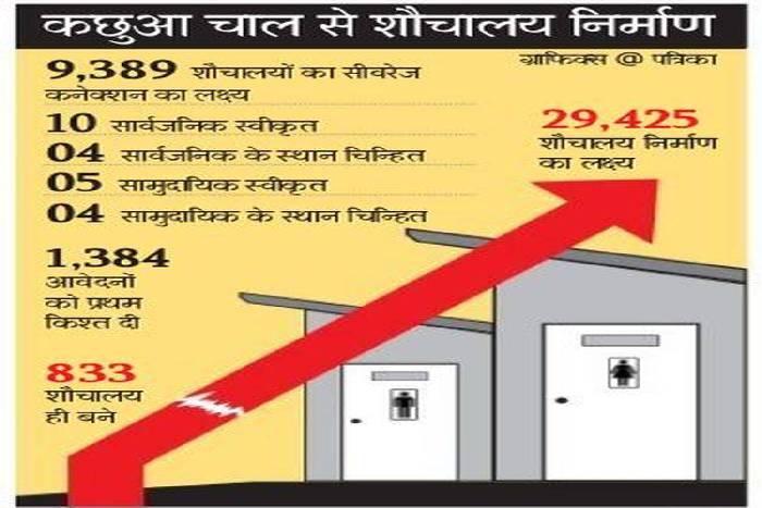 शौचालय विहीन आवेदनों में से प्रथम किश्त एक हजार 384 आवेदकों को दी गई। इसमें से मात्र 833 शौचालय निर्मित किए गए हैं। शेष के लिए डबलपिट के निर्माण के लिए टेण्डर जारी किए हुए हैं।