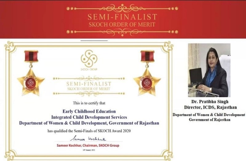 ‘स्कॉच ऑर्डर ऑफ मेरिट‘ के तहत विभिन्न चरणों जैसे डिजिटल प्रदर्शनी, पीपीटी, वीडियो डॉक्यूमेंटरी व वोटिंग के आधार पर शनिवार को वर्चुअल कार्यक्रम में आई.सी.डी.एस. राजस्थान को प्रारंभिक बाल्यवस्था शिक्षा में बेहतर कार्य करने के लिए ‘स्कॉच सिल्वर अवार्ड और स्कॉच ऑर्डर ऑफ मेरिट दो अवार्ड प्रदान किये गये है। डॉ. प्रतिभा सिंह ने उक्त दोनों अवार्ड प्राप्त किये।