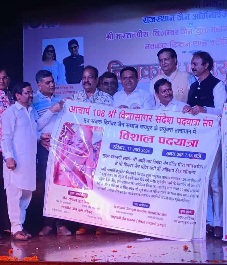 दिगंबर जैन संत शिरोमणि आचार्य विद्यासागर के संदेशों को जन-जन तक पहुंचाने व विनयांजलि के लिए 17 मार्च को आचार्य की समाधि के एक महीने पूरा होने पर विभिन्न कार्यक्रम जयपुर में आयोजित किए जाएंगे। एक लघु पद यात्रा व विनयांजलि सभा आयोजित होगी। इसके तहत पदयात्रा 17 मार्च रविवार सुबह सात मानसरोवर मीरा मार्ग आदिनाथ दिगंबर जैन मंदिर से रवाना होकर सांगानेर में संघी जी के मंदिर तक जाएगी। आसपास के क्षेत्रों से बड़ी संख्या में भक्त शामिल होंगे। सांगानेर मंदिर में आचार्य की जीवनी पर आधारित एक लघु फिल्म भी दिखाई जाएगी। आचार्य प्रवचन एवं उनके संदेश की महत्ता बताई जाएगी। जैन सोशल ग्रुप जनक, राजस्थान जैन युवा महासभा के मानसरोवर जोन एवं भारतीय जैन युवा परिषद की ओर से से होने वाले कार्यक्रम के पोस्टर का विमोचन भट्टारक जी नसियां में किया गया। मानसरोवर जोन अध्यक्ष राजेश काला, मुख्य संयोजक अक्षय लुहाड़िया, मनीष झांझरी सहित अन्य लोग मौजूद रहें।