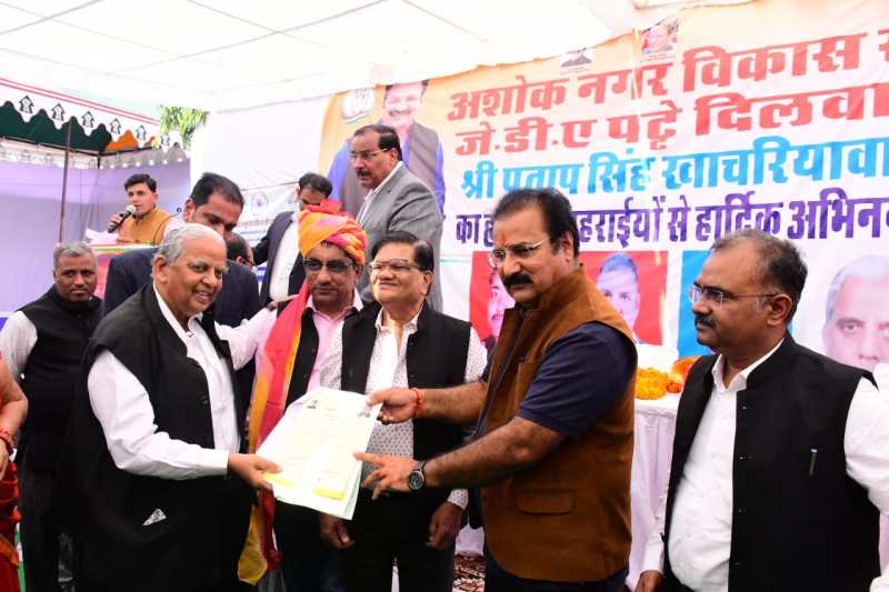 जयपुर। अजमेर रोड स्थित अशोक नगर में जेडीए की ओर से लगाए गए शिविर में गुरुवार को खाद्य एवं नागरिक आपूर्ति मंत्री प्रताप सिंह खाचरियावास ने लोगों को पट्टे बांटे। 72 लोगों को उन्होंने पट्टे दिए। 40 वर्ष के लम्बे इंतजार के बाद अशोक नगर में पट्टे मिले हैं। उन्होंने कहा कि अभियान अभी बंद नहीं होगा। दो वर्ष तक चलेगा।अभियान में पट्टे देने की गति को तेज किया जाएगा। नियमित रूप से जेडीए और नगर निगम के शिविरों का दौरा करेंगे।