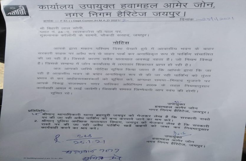हरिटेज नगर निगम के हवामहल आमेर जोन उपायुक्त की ओर से पौंड्रिक पार्क बचाओ संघर्ष समिति के मनीष सोनी के पिता को नोटिस जारी किया गया है। इस नोटिस में आवासीय भवन के बाहर सरकारी सड़क पर अवैध रूप से वाहन पार्क कर अनाधिकृत पार्किंग संचालित करने और यातायात अवरुद्ध रहने की बात कही गई है। इसके साथ ही इस सड़क पर वाहन खड़े नहीं करने और जोन उपायुक्त को सूचित करने की बात भी कही गई है। ऐसा नहीं करने पर नगर पालिका अधिनियम के तहत कार्यवाही करने की बात कही है। इतना ही नहीं, इस नोटिस की एक—एक प्रतिलिपि संबंधित पुलिस थाने और ट्रैफिक पुलिस को भी कार्रवाई के लिए दी गई है।