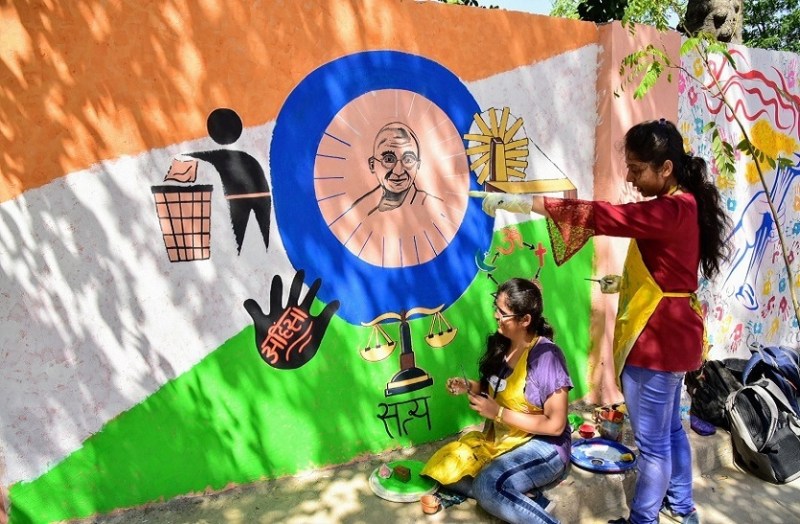 एमजीडी स्कूल की सृष्टि, काव्या, अक्षिता, ईशिता, छवि, सेजल निशिता, अनुष्का, वंदिता ने मुख्य गेट पर अपनी कला में सिटीजनशिप को दिखाया है। पेंटिंग में 'नजरिया बदलो नजारा अपने आप बदल जाएगाÓ सोच को ध्यान में रखते हुए तैयार की है। इसमें भारत की आंखें खुली हुई दिखाई है और देश के प्रमुख मॉन्यूमेंट्स को एकता की माला में पिरोया है। राजस्थान स्कूल ऑफ आट्र्स की भानू कुमावत और प्रियंका मीणा ने गांधी के विचारों का समावेश पेंटिंग में किया। इन्होंने बिना ब्रश इस्तेमाल किए स्पंच के पेक्चर्स बनाकर गांधी का पोट्रेट बनाया है।