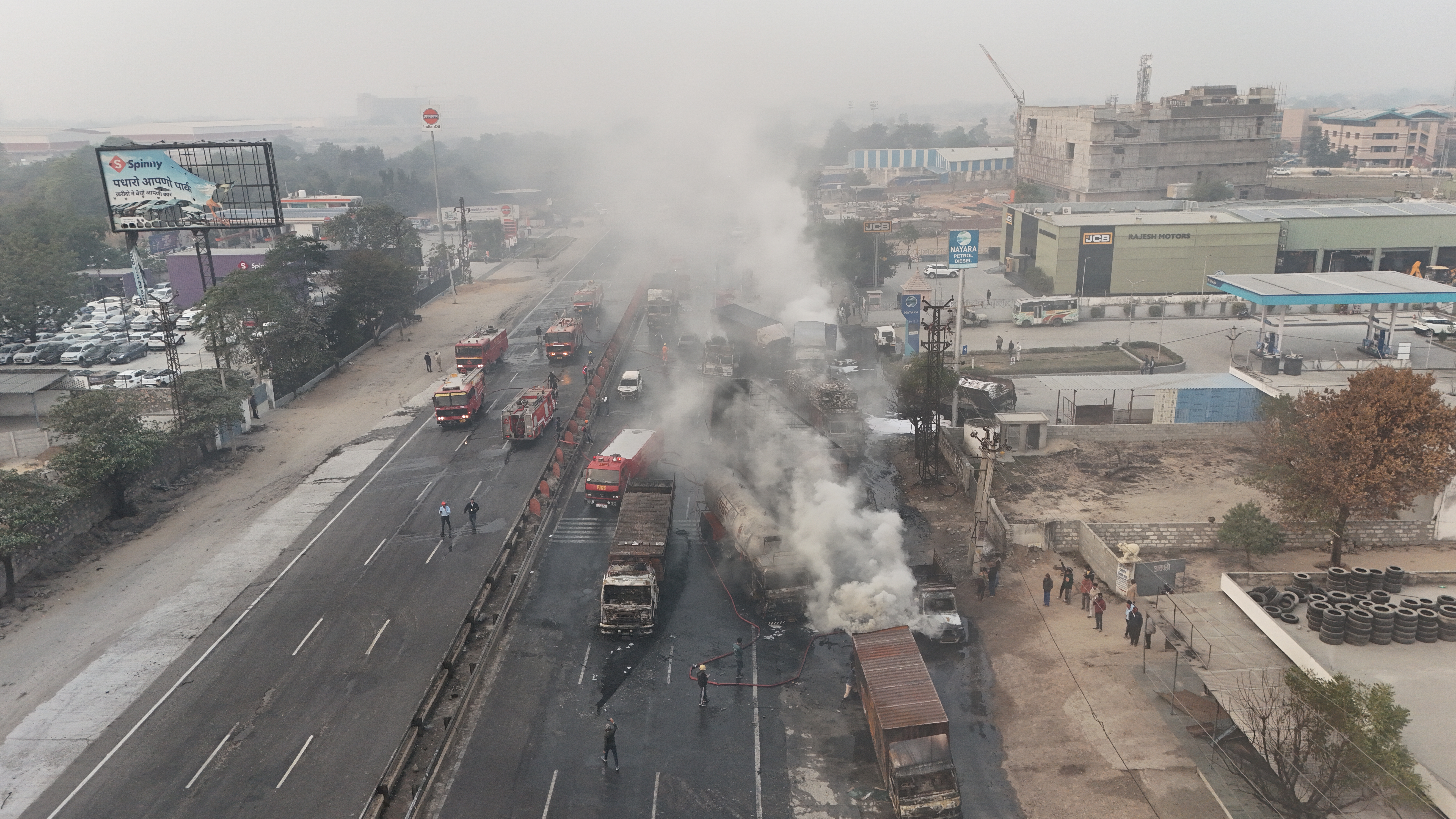 इस भीषण आग में 30 ट्रक, 7 कारें, 2 बसें, 2 ऑटो और 7 बाइक जलकर खाक हो गईं। इसके अलावा, आसपास की दुकानों और गोदामों को भी भारी नुकसान हुआ है। सरकार ने घटना की जांच के आदेश दिए हैं और लोगों से संयम बनाए रखने की अपील की है। हाईवे को फिलहाल डायवर्ट कर दिया गया है और प्रशासन स्थिति पर नजर बनाए हुए है।
