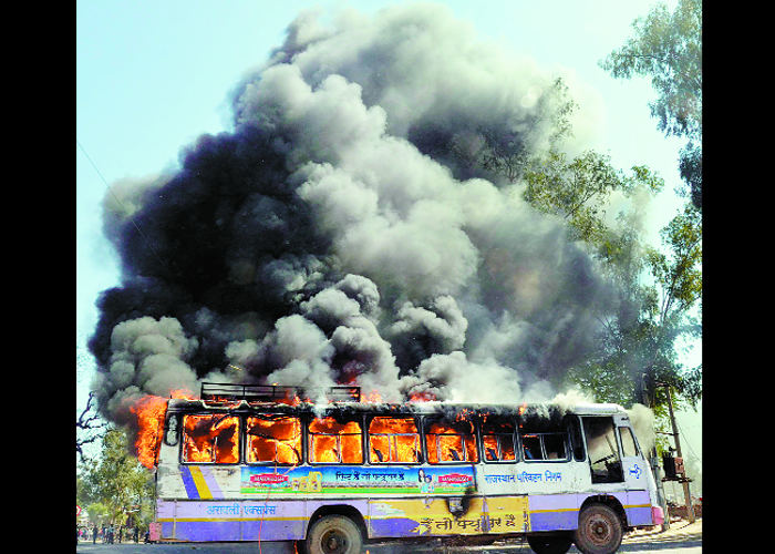 धौलपुर-भरतपुर जिले के जाटों को आरक्षण की मांग व हरियाणा के जाट आरक्षण आंदोलन के समर्थन में सोमवार को भरतपुर जिले में जाट समाज लाठी-डंडे लेकर सड़कों पर उतरा। उग्र आंदोलनकारियों ने रोडवेज की दो बसें फूंक दी। निजी वाहनों तथा सरकारी सम्पत्ति में जमकर तोडफ़ोड़ की। दूसरे दिन अचानक हिंसक हुए आंदोलन से जनजीवन प्रभावित हुआ। जिले में रोडवेज बसों व ट्रेनों का संचालन ठप रहने से हजारों मुसाफिर फंसे रहे।