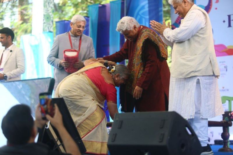 सीपियां के विमोचन के दौरान जावेद अख्तर के पांव छूते हुए राज्यसभा सांसद सुधा मूर्ति।