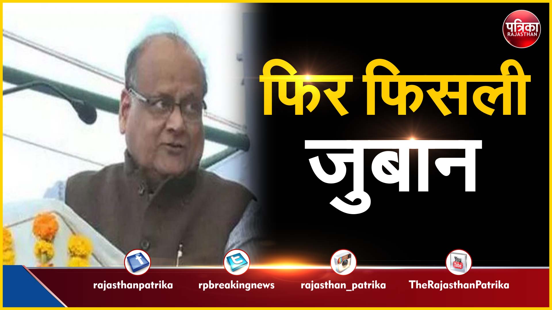 जयपुर के मालवीय नगर से विधायक और पूर्व चिकित्सा मंत्री कालीचरण सराफ की जुबां गुरुवार को फिर फिसल गई। पूर्व चिकित्सा मंत्री और मालवीय नगर से विधायक कालीचरण सराफ उनके विधान सभा क्षेत्र के महेश नगर में करतारपुरा नाले पर हो रहे अतिक्रमण हटाने और भाजपा सरकार के समय शुरू किए गए ट्रीटमेंट प्लांट को फिर से शुरू कराने के लिए करतारपुरा नाले पर धरना देने गए थे। धरने पर सराफ ने स्थानीय लोगों को संबोधित करते हुए उनकी जुबां फिर फिसल गई। सराफ ने कह दिया कि जब राज होता है तब कलम के दम पर काम होता है और जब राज नहीं है तो संघर्ष और जूते के जोर पर भी वे काम कराना जानते है।