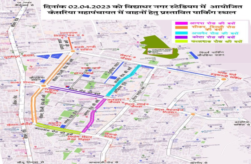 Jaipur News : शहर के विद्याधर नगर स्टेडियम (Vidyadhar Nagar Stadium) में केसरिया महापंचायत (Kesaria Mahapanchayat) का कार्यक्रम होना है। इस दौरान आमजन की सुविधा को देखते हुए यातायात व्यवस्था इस प्रकार रहेगी।