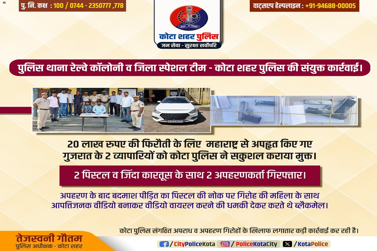 जयपुर। कोटा पुलिस ने एक बड़ी कार्रवाई करते हुए महाराष्ट्र से अगवा किए गए गुजरात के दो व्यापारियों को सकुशल मुक्त कराया है। पुलिस ने दो अपहरणकर्ताओं को गिरफ्तार कर उनके पास से दो पिस्टल और एक जिंदा कारतूस बरामद किया है। यह गिरोह ब्लैकमेल के लिए गन पॉइंट पर अश्लील वीडियो बनाते थे, ये बदमाश पहले भी ब्लैकमेल करके लोगों से लाखों रुपये वसूल चुके हैं।