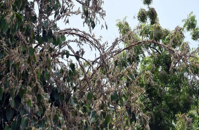 जोधपुर शहर के बासनी सरस्वती नगर डी सेक्टर के पार्क में लगे पेड़ों पर बैठा टिड्डी दल।