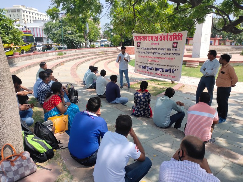 प्रदेश के एमएड डिग्रीधारी बेरोजगारों (M.Ed degree holder unemployed ) ने मंगलवार को शहीद स्मारक पर धरना देते हुए सरकारी नौकरी में अवसर दिएज ाने, बीएड कॉलेजों के कोर्स में एकरूपता लाए जाने की मांग की। साथ ही चेतावनी भी दी कि यदि सरकार ने उनकी मांगों पर ध्यान नहीं दिया तो वह बड़ा आंदोलन करने पर मजबूर होंगे। एमएड संघर्ष समिति, राज स्ववित्तपोषित महाविद्यालय शिक्षक महासंघ और शिक्षक प्रशिक्षक प्रगतिशील समिति के बैनर तले एमएड योग्यताधानी बेरोजगार युवा मंगलवार को शहीद स्मारक पर एकत्र हुए और धरना दिया। एमएड संघर्ष समिति के अध्यक्ष रामबाबू जांगिड़ ने बताया कि राजस्थान में पिछले कई सालों से एम एड की पढ़ाई करवाई जा रही है लेकिन सरकारी सेवा में इसका उपयोग नहीं हो रहा। प्रदेश में संचालित डाइट के साथ डीएलएड कॉलेजों में योग्यताधारी स्टाफ नहीं है और डाइट्स में एनसीटीई के मानदंडों के अनुसार कभी कोई भर्ती नही ंहुई है ऐसे में अब सरकार को इन कॉलेजों में योग्यताधारियों की सीधी भर्ती करनी चाहिए साथ ही सभी सरकारी कॉलेजों में चार वर्षीय एकीकृत बीए बीएड, बीएससी बीएड पाठ्यक्रम शुरू करने के साथ ही स्कूल और कॉलेज शिक्षा में शिक्षा शास्त्र विषय शुरू किया जाना चाहिए जिससे एमएड डिग्री धारकों के साथ न्याय हो सके साथ ही उच्च माध्यमिक व स्नातक स्तर से ही शिक्षा शास्त्र विषय पढऩे की सुविधा मिल सके।
