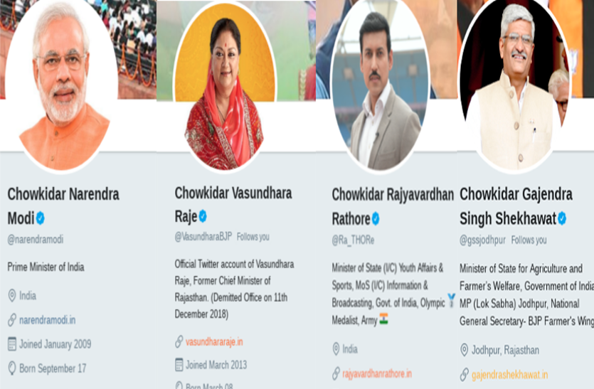 इन सभी नेताओं ने अपने ट्विटर एकाउंट पर कैंपेन के तहत नाम बदलते हुए अपने नाम के आगे चौकीदार शब्द का उपयोग किया है। वहीं सबसे ज्यादा चौंकाने वाली बात ये है कि बीजेपी नेताओं के अलावा भी बहुत से आम लोगों ने अपने नाम के आगे चौकीदार लगा लिया है।
