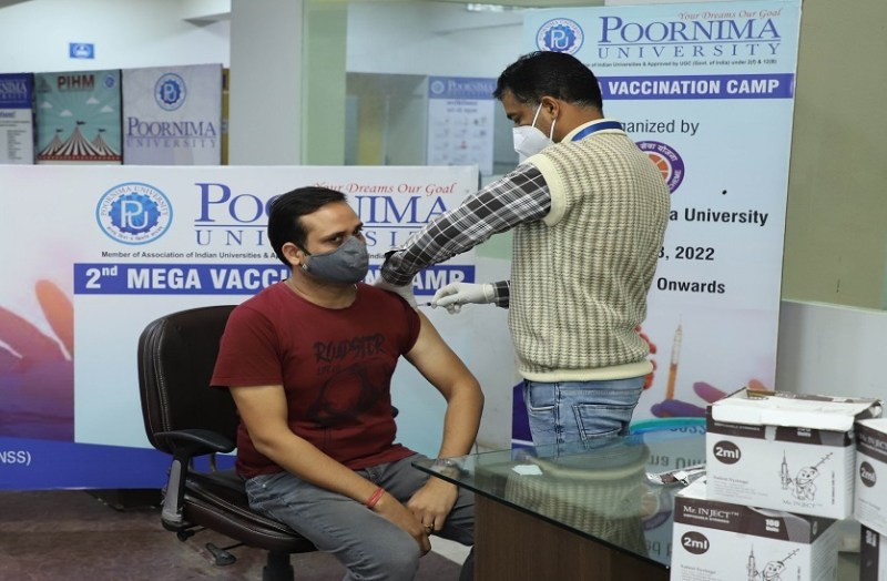 जयपुर। पूर्णिमा यूनिवर्सिटी की एनएसएस इकाई की ओर से शनिवार को यूनिवर्सिटी कैंपस में मेगा कोविड वैक्सीनेशन कैंप लगाया गया। इसमें आरयूएचएस और गवर्नमेंट हॉस्पिटल गोनेर के विशेषज्ञों ने 360 लोगों को वैक्सीन लगाई गई। कैंप के संयोजक डॉ. राकेश गुप्ता ने बताया कि इसमें स्टूडेंट्सए फैकल्टी व स्टाफ मेम्बर्स के साथ आसपास के स्थानीय निवासियों का भी उत्साह देखने को मिला। यहां दांतली, गोनेर, विधाणी व जगतपुरा क्षेत्र के 15 से 18 वर्ष आयुवर्ग के युवाओं की भी काफी संख्या रही। पंजीकरण की प्रक्रिया के बाद स्वास्थ्य विशेषज्ञों द्वारा लाभार्थियों को फस्र्ट व सैकंड डोज लगाई गई। साथ ही विशेषज्ञों ने स्टूडेंट्स को कोविड से बचाव के लिए वैक्सीन के साथ मास्क व सैनेटाइजर की उपयोगिता पर भी जोर दिया।