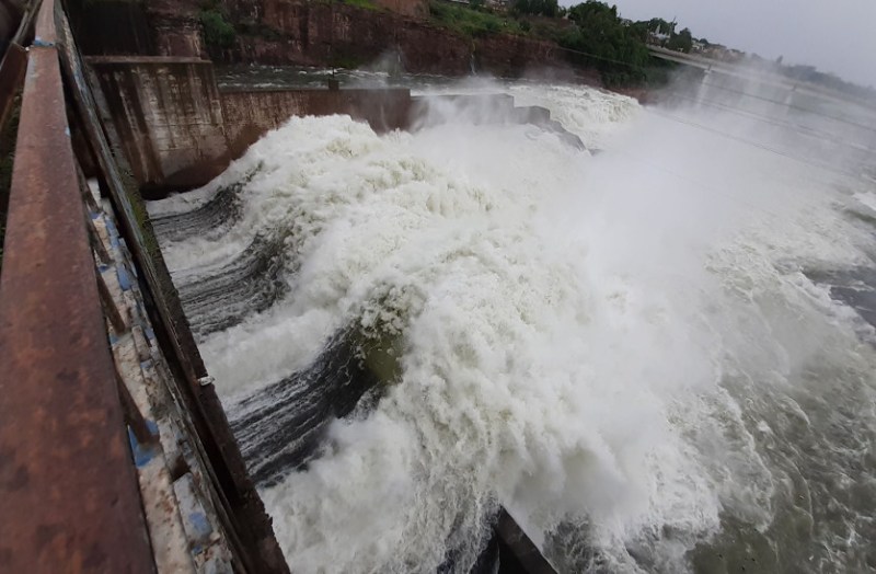 हाड़ौती में हुई झमाझम बारिश के बाद शनिवार को कोटा स्थित कोटा बैराज बांध के पांच गेट तीन-तीन फुट खोल दिए जाने के बाद का दृश्य।