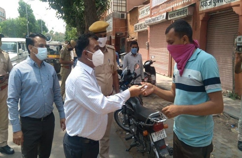 परकोटा में मास्क बांटते हैरिटेज नगर निगम अफसर।