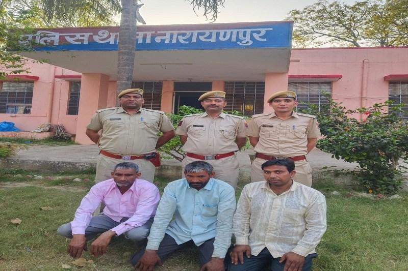 पुलिस महानिरीक्षक जयपुर रेंज अजयपाल लाम्बा एवं जिला पुलिस अधीक्षक राजन दुष्यन्त के निर्देशानुसार सभी थाना प्रभारियों को अपराधियों की धरपकड़ के लिए विशेष अभियान चलाने के आदेश दिए गए थे। इसी के तहत अतिरिक्त पुलिस अधीक्षक वैभव शर्मा और वृत्ताधिकारी बानसूर दशरथ सिंह के निर्देशन में थानाधिकारी ओमप्रकाश मीणा के नेतृत्व में कार्रवाई करते हुए तीनों आरोपियों दुर्गाराम पुत्र सोहन लाल सैनी निवासी मालोडी की ढाणी पुलिस थाना नारायणपुर ,लहरीराम सैनी पुत्र चोथूराम सैनी निवासी मालोडी की ढाणी पुलिस थाना नारायणपुर व रतनलाल पुत्र चोथमल सैनी निवासी मालोडी का ढाणी पुलिस थाना नारायणपुर को गिरफ्तार कर लिया गया। गिरफ्तार आरोपियों के खिलाफ विभिन्न धाराओं के तहत मामला दर्ज था लेकिन अपराध करने के बाद से ये फरार चल रहे थे। पुलिस द्वारा आरोपियों से पूछताछ जारी है।